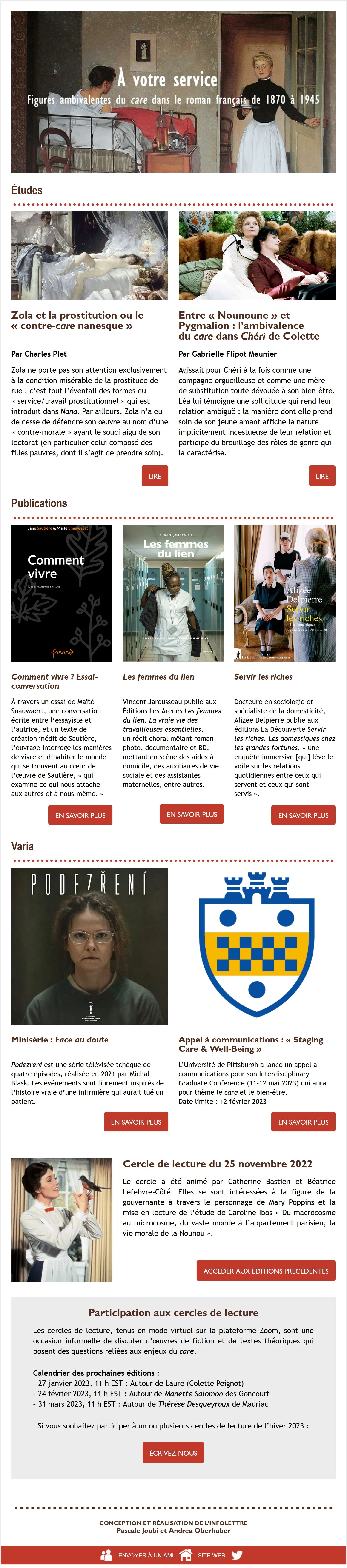 Le courrier du care est une infolettre bimestrielle proposant un aperçu des activités de l’équipe de recherche et une sélection de publications récentes (ouvrages, romans, films, podcasts…) et d’événements consacrés aux enjeux du care.